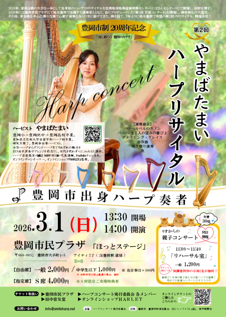 午前は0歳から楽しめる親子コンサート、午後は7年ぶりとなる第2回ハープリサイタル。